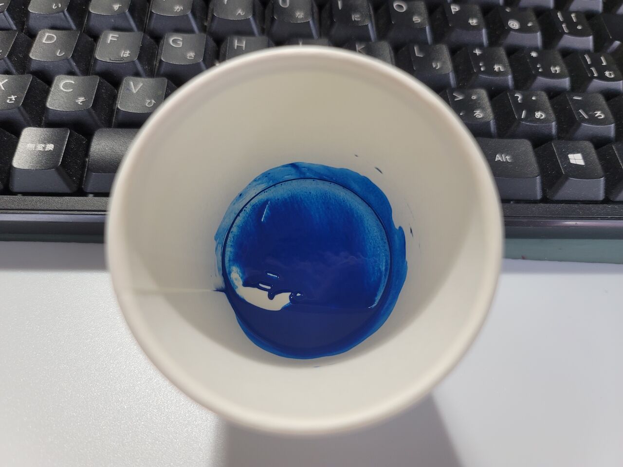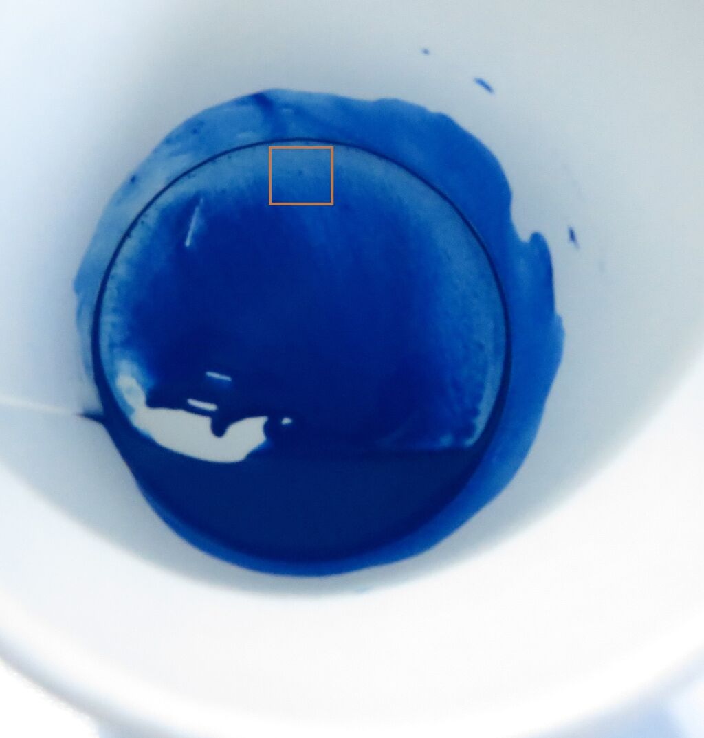 写真は少しわかりづらいですが、アクリジョンをうすめ液で希釈した後にカップを斜めに傾けて濃度を見るようにしています。