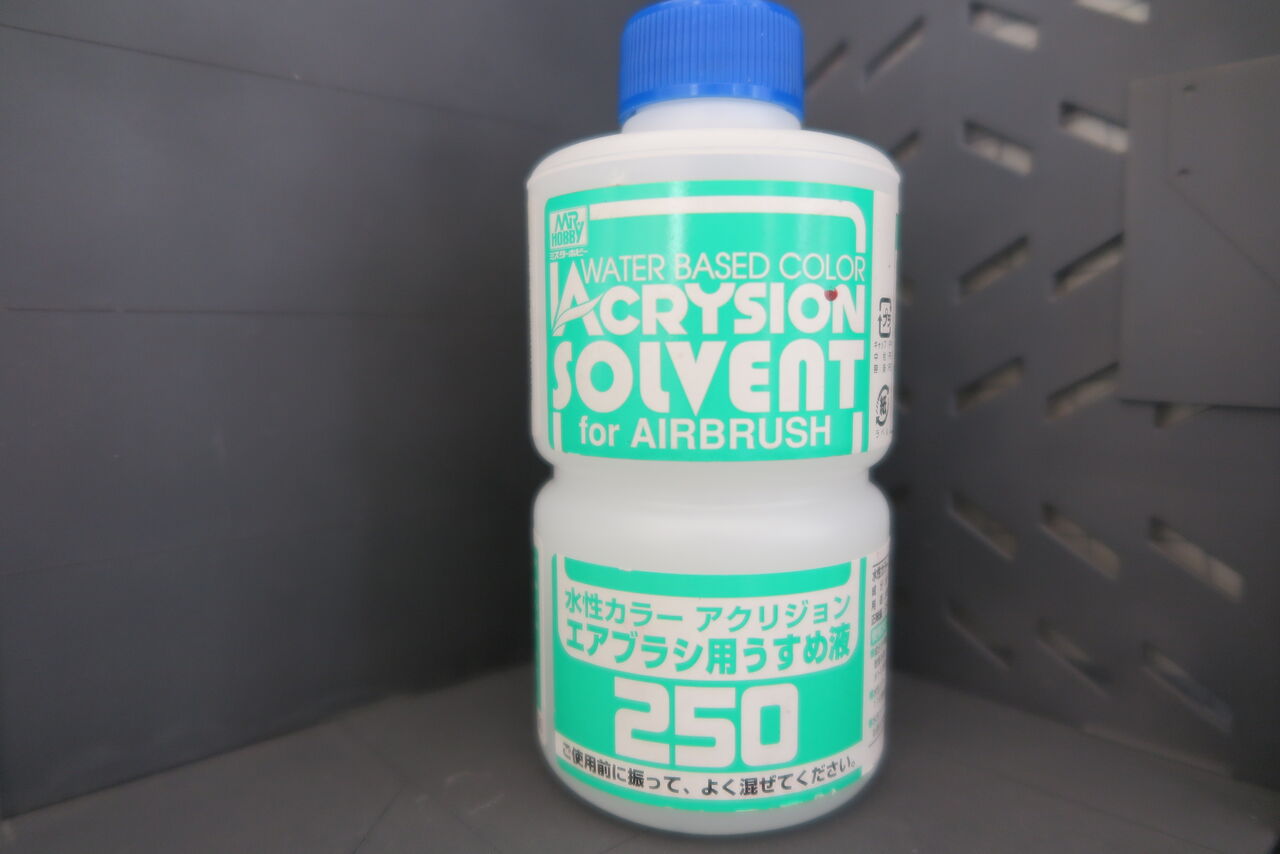 この記事を書いた時点では、旧「エアブラシ用うすめ液」を使用していました。現在は「アクリジョンエアブラシ用うすめ液改」が販売されています。