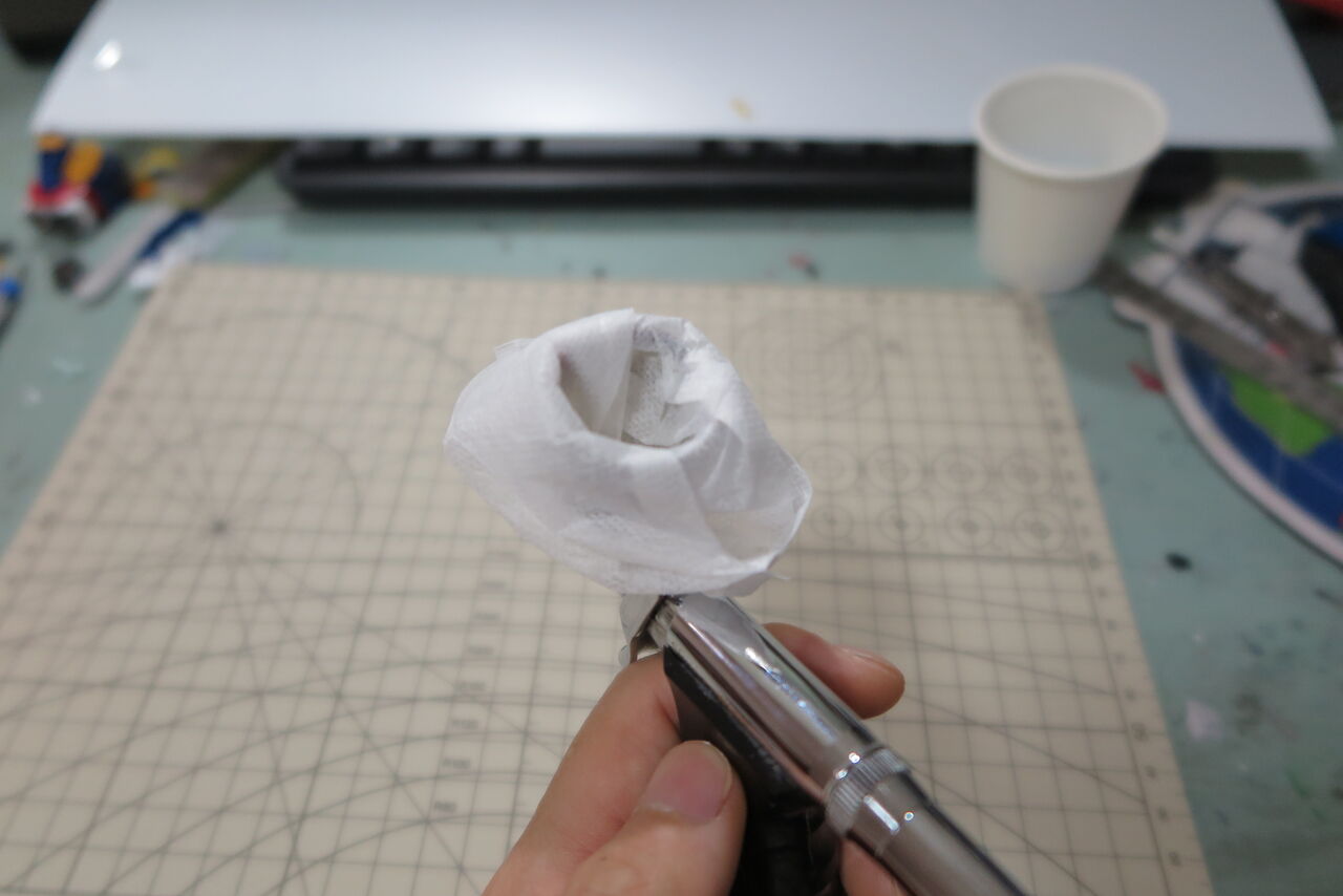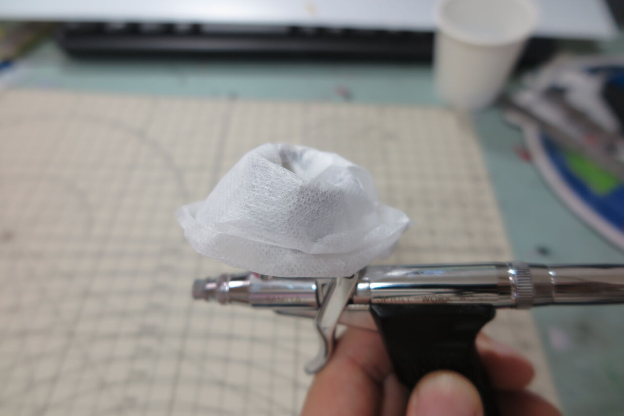 この時、よく水で流さないとエアブラシ内に塗料が残る原因となるので、よく洗いましょう。